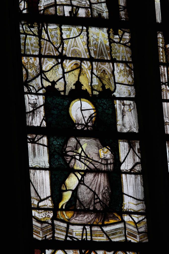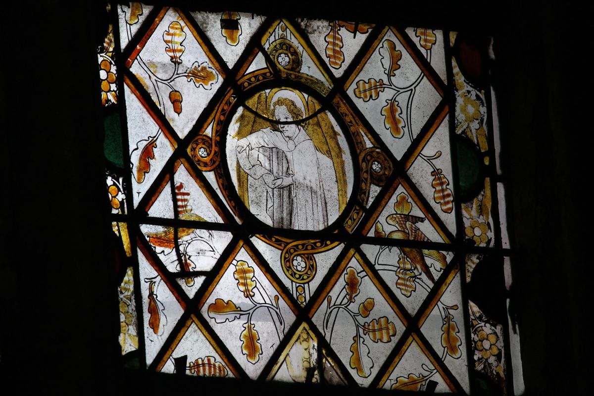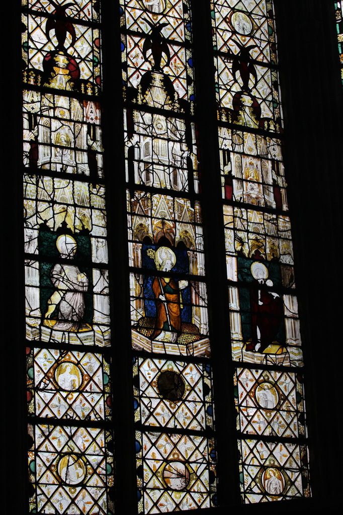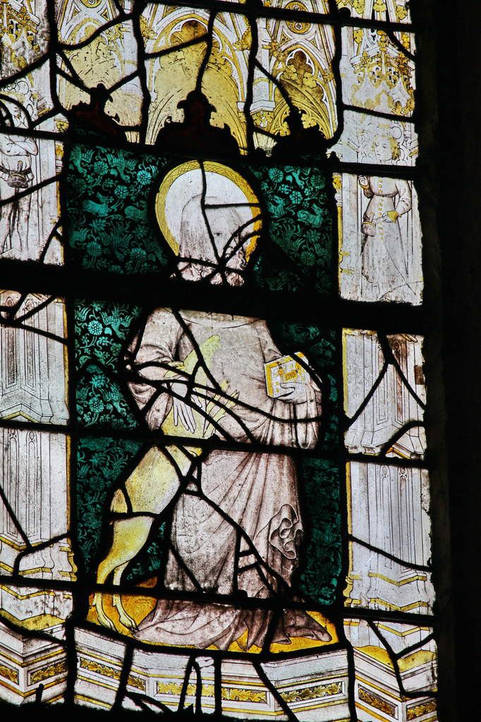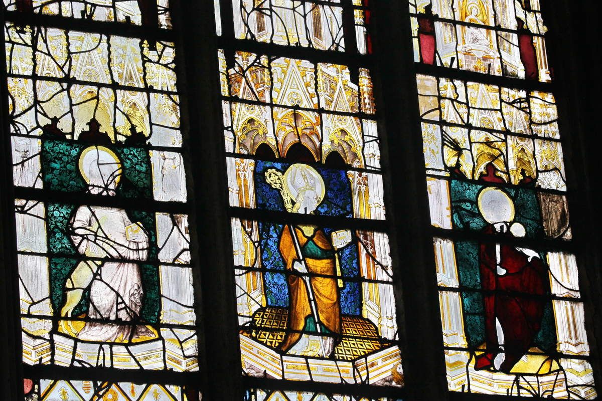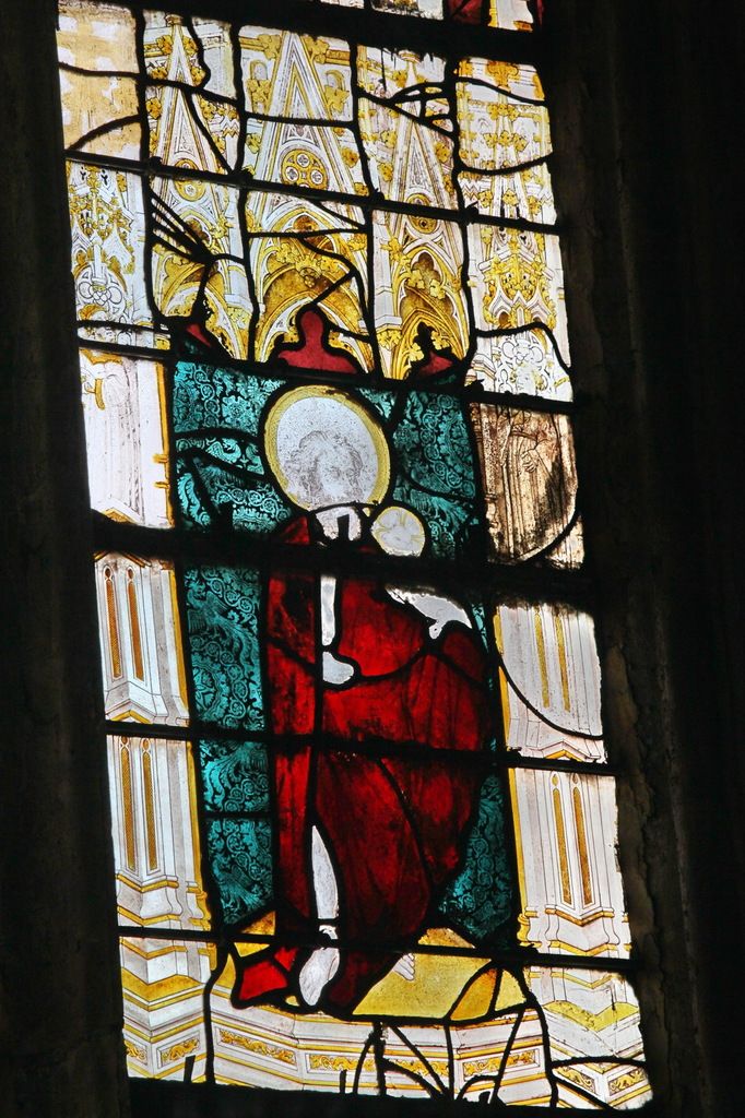 Ici, ce sont trois édicules hexagonaux qui sont insérés en litre dans une vitrerie losangée décorée en grisaille et jaune d'argent. Saint Gilles (avec sa biche et saint Jean-Baptiste (avec l'Agneau) entourent un saint évêque, chacun dans un niche tendue d'un précieux damassé.