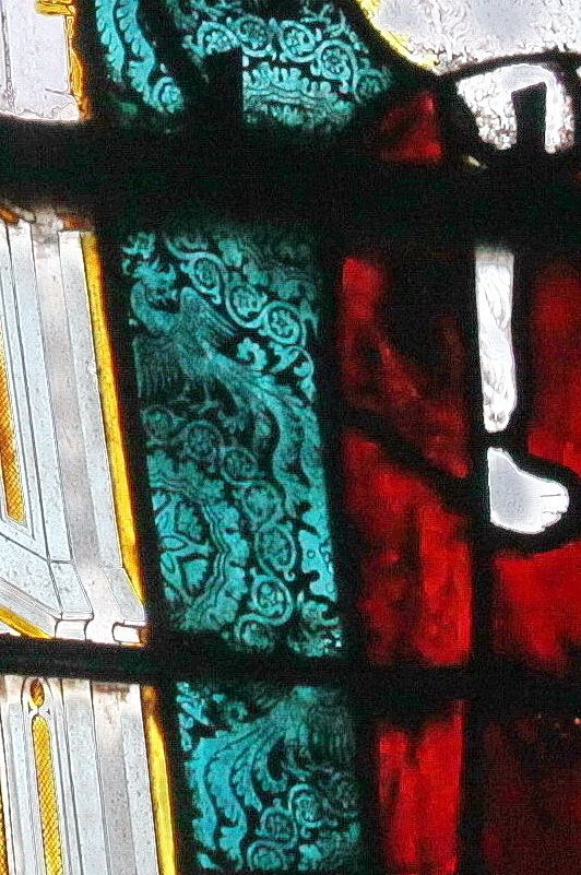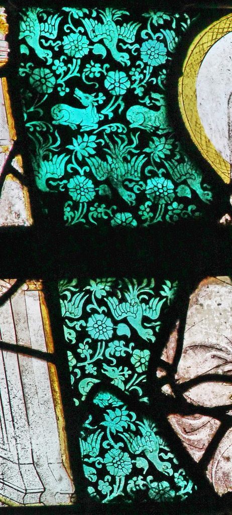 Le splendide damas, restauré par Didron, est tracé sur un verre bleu couvert d'un lavis de grisaille. Des couples de perruches, aux forts becs de perroquet et aux longues queues à quatre plumes, sont de couleur verte, car le verre bleu a été peint au jaune d'argent. Elles enveloppent de leur forme en S une masse de sept fleurs crénelées placée au sommet d'un réseau de tiges qui distribuent ailleurs des feuilles en crochets, d'autres fleurdelisées et d'autres encore.