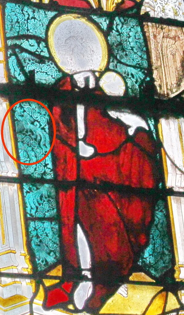 Il semble, malgré les plombs de casse, qu'il s'agisse d'une seule pièce de verre blanc depuis le sol jusqu'au sommet du nimbe. Le sol, la biche, la tranche du livre et ses ferrures de la reliure, et la périphérie du nimbe, sont peints au jaune d'argent.