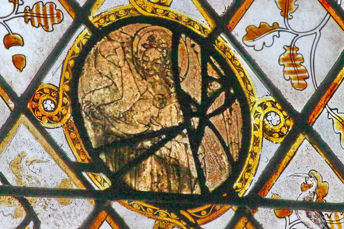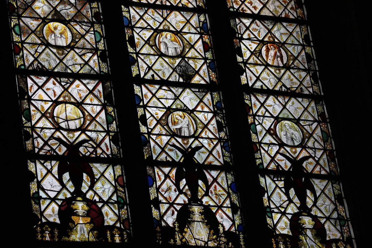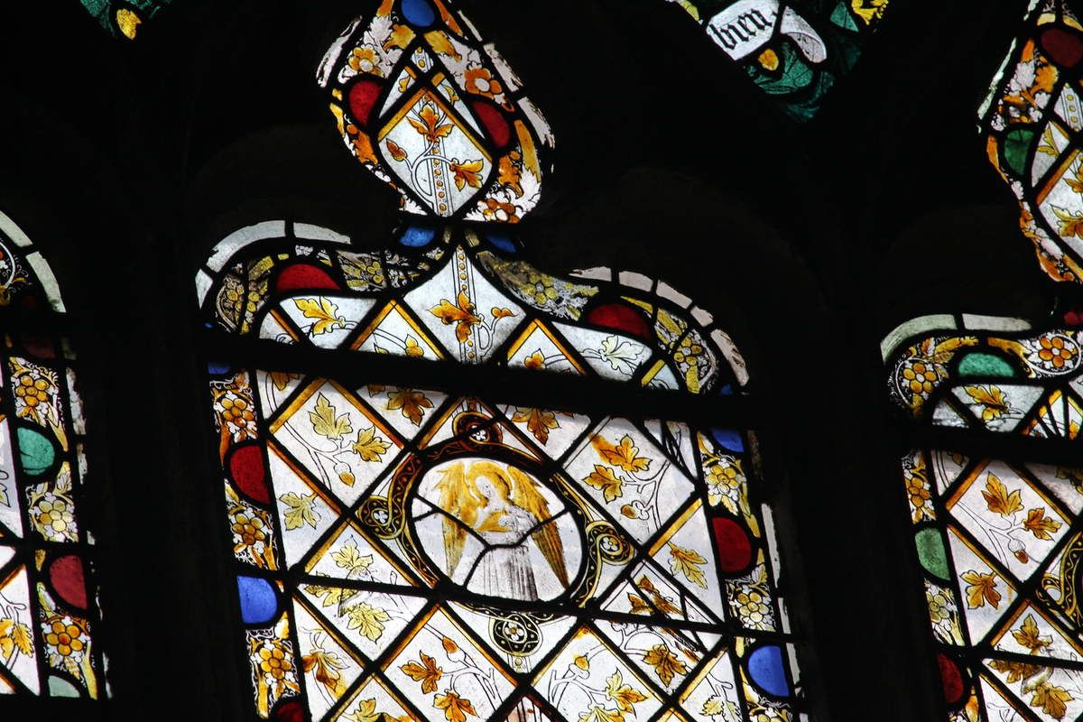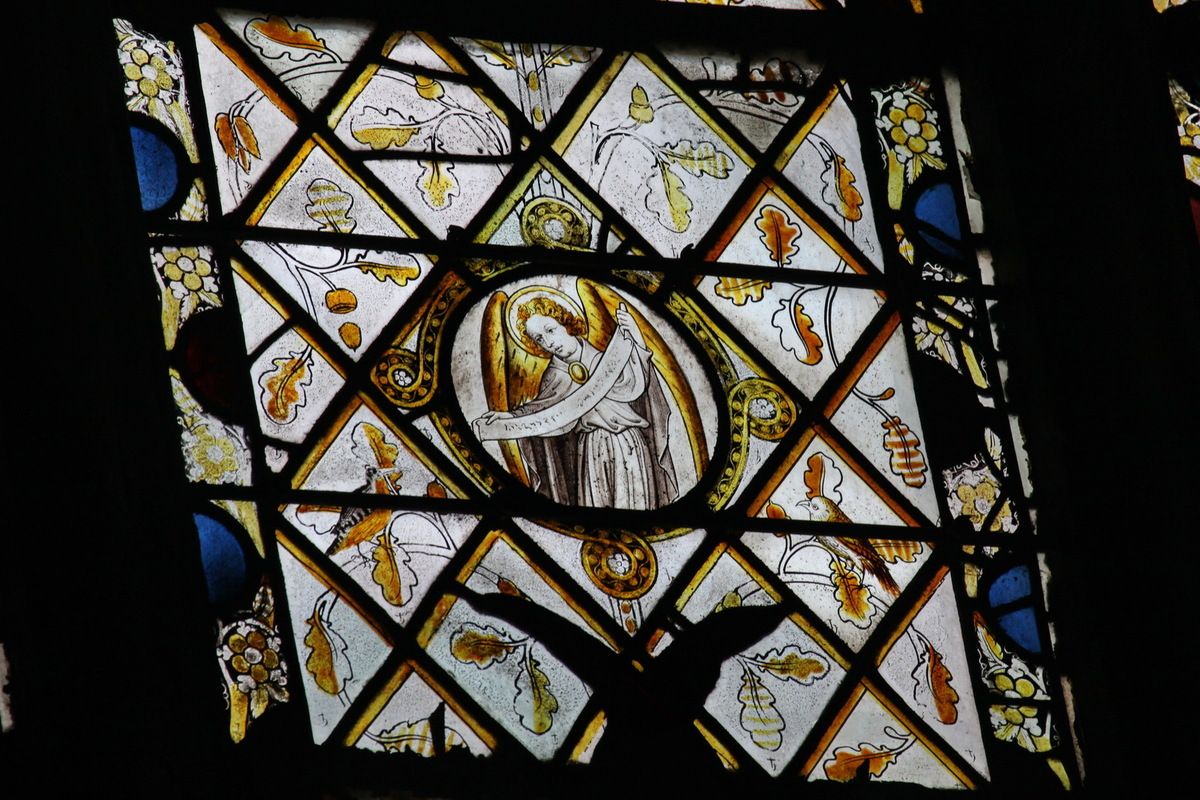 LA VITRERIE À LOSANGES ET SES MÉDAILLONS AUX ANGES MUSICIENS.