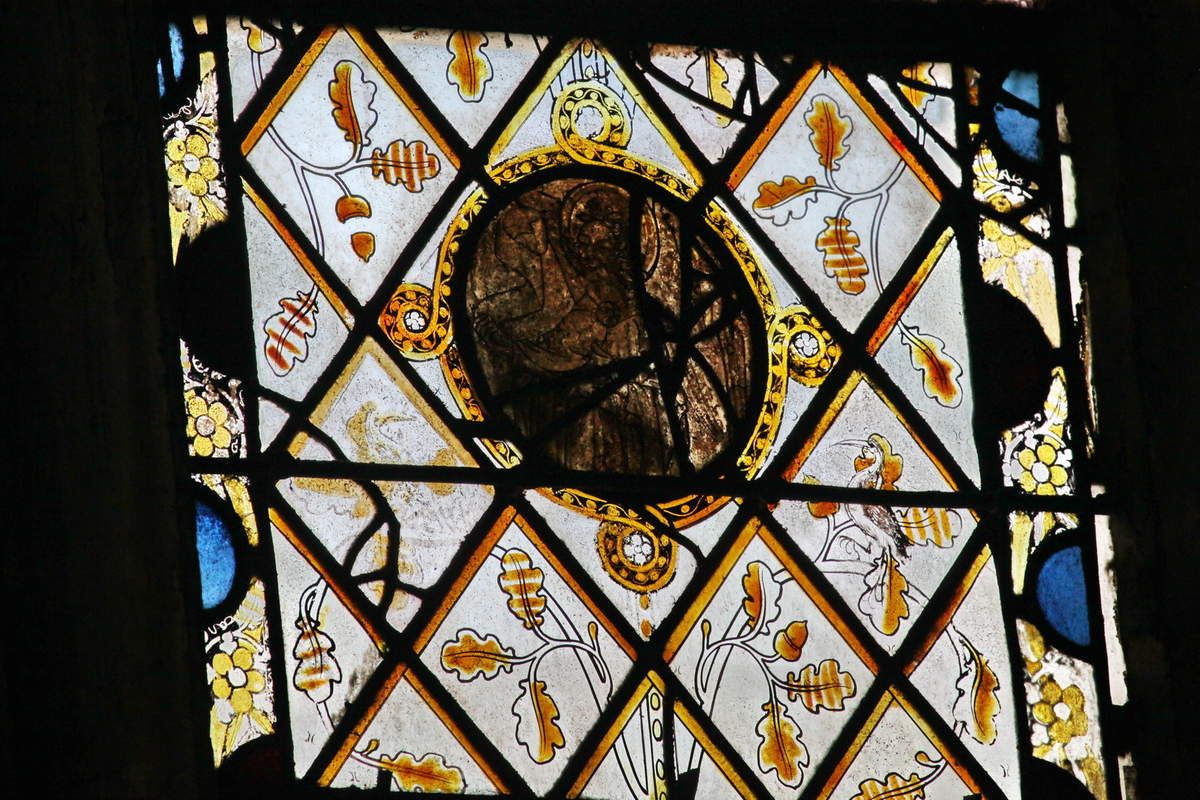 Le motif de cette lancette de la baie 19 est enlevé sur un lavis de grisaille appliqué sur un verre vert.