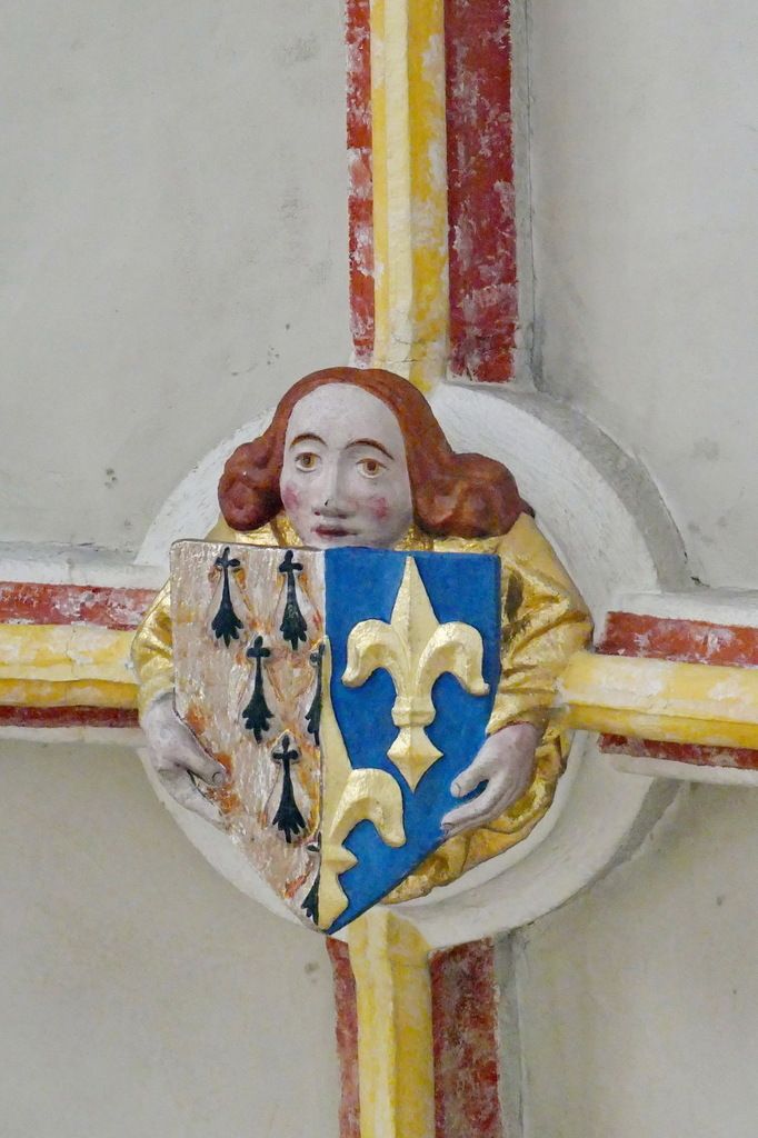 Elle est datée de 1360-1370 — et pour le tympan d'après 1387— et comporte dans les trois soufflets du tympan des armes, le mot EN BIEN, (plus précisément ENBIEN, comme sur son chapel) et le chiffre (la lettre K) ou les emblèmes aux cerfs ailés et aux fleurs de genêt (montés en chef d'œuvre) du roi Charles VI qui régna de 1380 à 1422. (Dès le milieu du XIVe siècle, parallèlement à la tradition des armoiries héréditaires (ici, l’emblème royal des fleurs du lys), naît en Occident l'usage des « devises » qui comprend un « mot » (enbien) et un corps (un cerf ailé blanc).