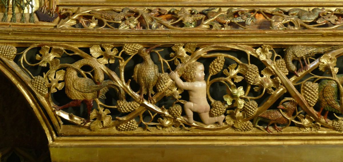 Le fauteuil est sculpté de personnages qui portent des phylactères : l'Écriture est partout. On compte dix petits personnages sur cette seule image.