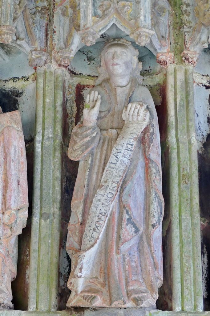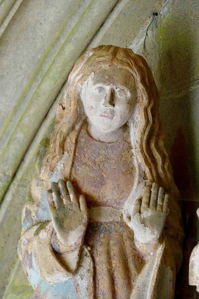 Comparer aussi cette Annonciation à celle de La Ferrière (22) : la coiffure de l'Ange y est aussi méchée et ébouriffée qu'à Rumengol. Ce serait, réalisé entre 1423 et 1468, une autre réalisation d l'atelier du Folgoët) :