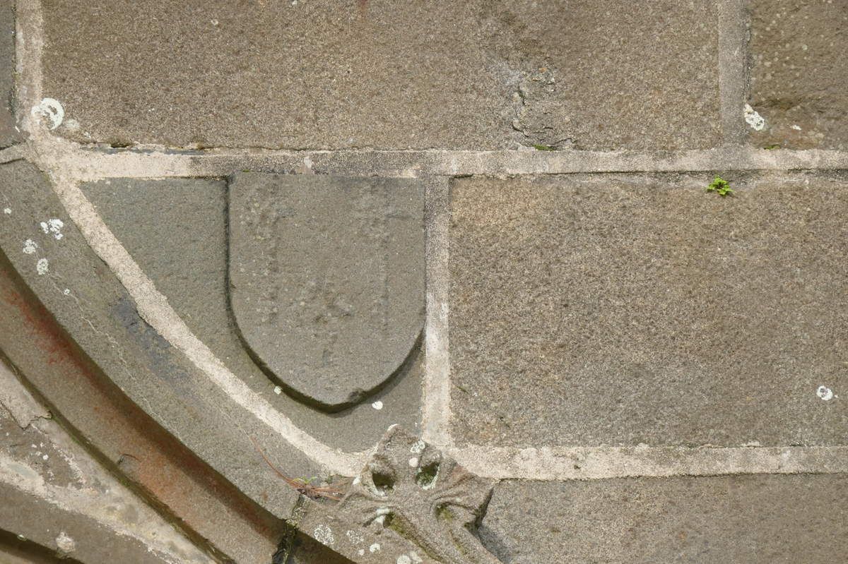 A droite de l'arcade, un blason est martelé, mais il reste suffisamment lisible pour y distinguer les armes de la famille de la Bourdonnaye de gueules à trois bourdons d'argent posés en pal (Bourdon = bâton de pèlerin muni de deux pommes -sphères-, l'une au trois quarts, l'autre au sommet). Elles sont aussi visibles sur le pignon de l'église du Faou . Voir ici la source de ces info et de l'image